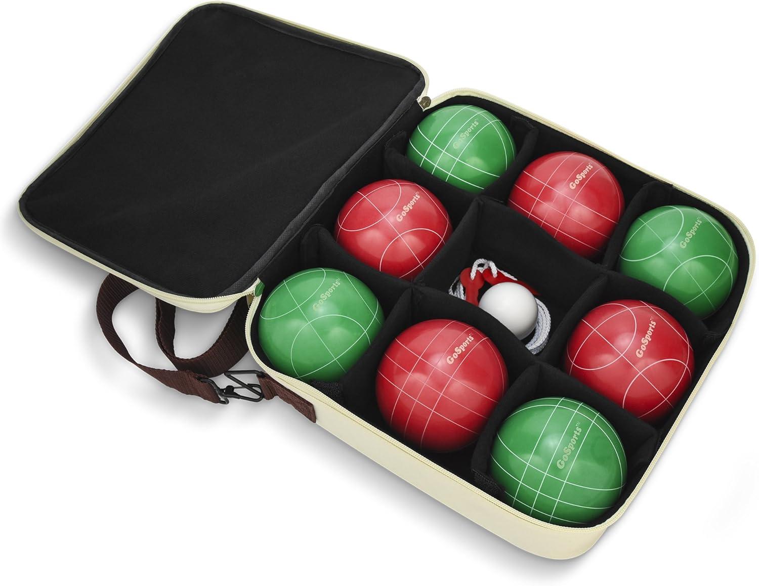 The GoSports 100mm Bocce Set is a full size premium set for bocce enthusiasts. The set includes 8 throwing balls, including the traditional colors of 4 red (2 circle cut, 2 square cut), 4 green (2 circle cut, 2 square cut and a 45 mm white pallino. This classic color combination allows anywhere from 2 to 4 players to compete at one time. The set can be used both for official courted Bocce as well as free play Bocce. Each ball is made from high quality polyresin to provide a high gloss, defect free finish. Each ball weighs 2 pound, 5 ounces. The set includes a high quality canvas carrying case with shoulder strap so you can take your Bocce game on the road and then store it without losing any pieces. Also included are official rules and a measuring device to help settle any close calls.