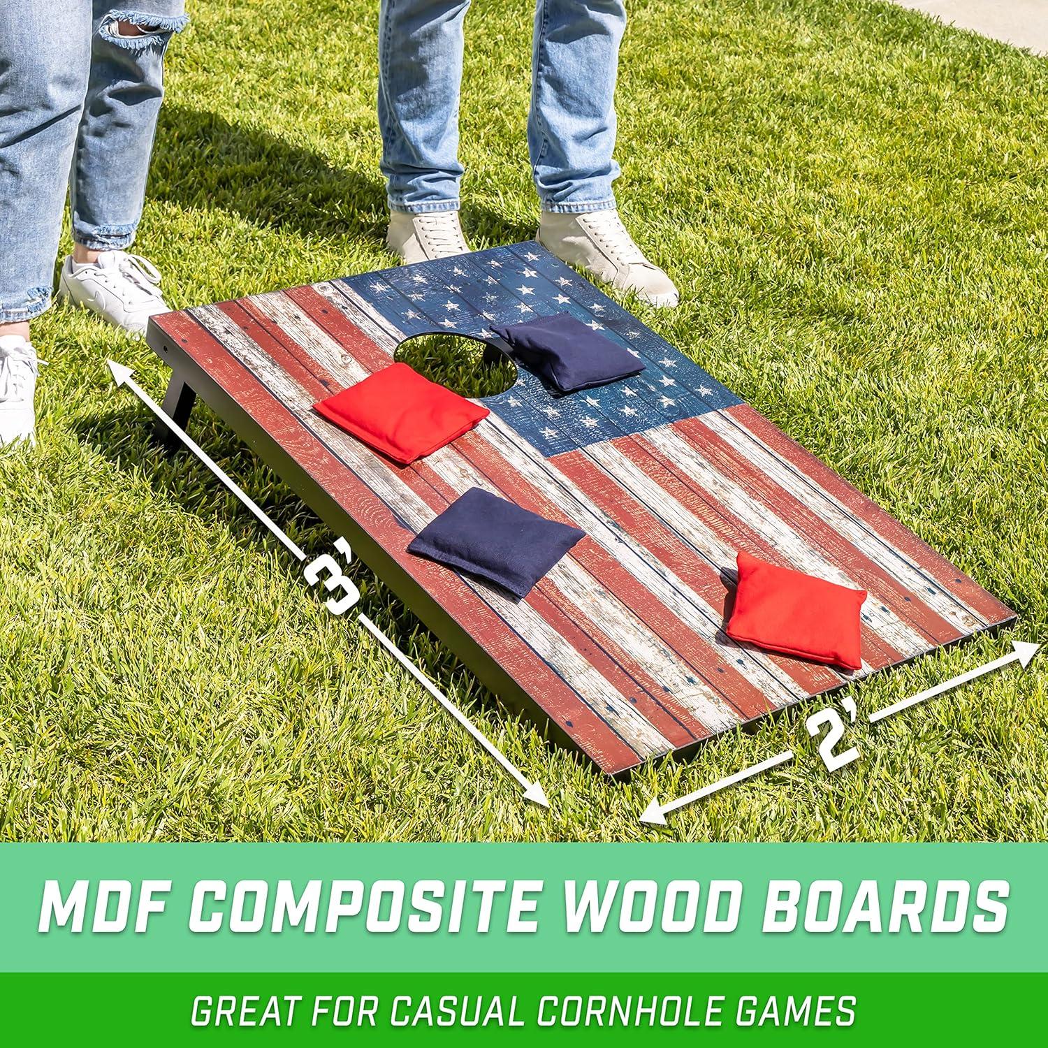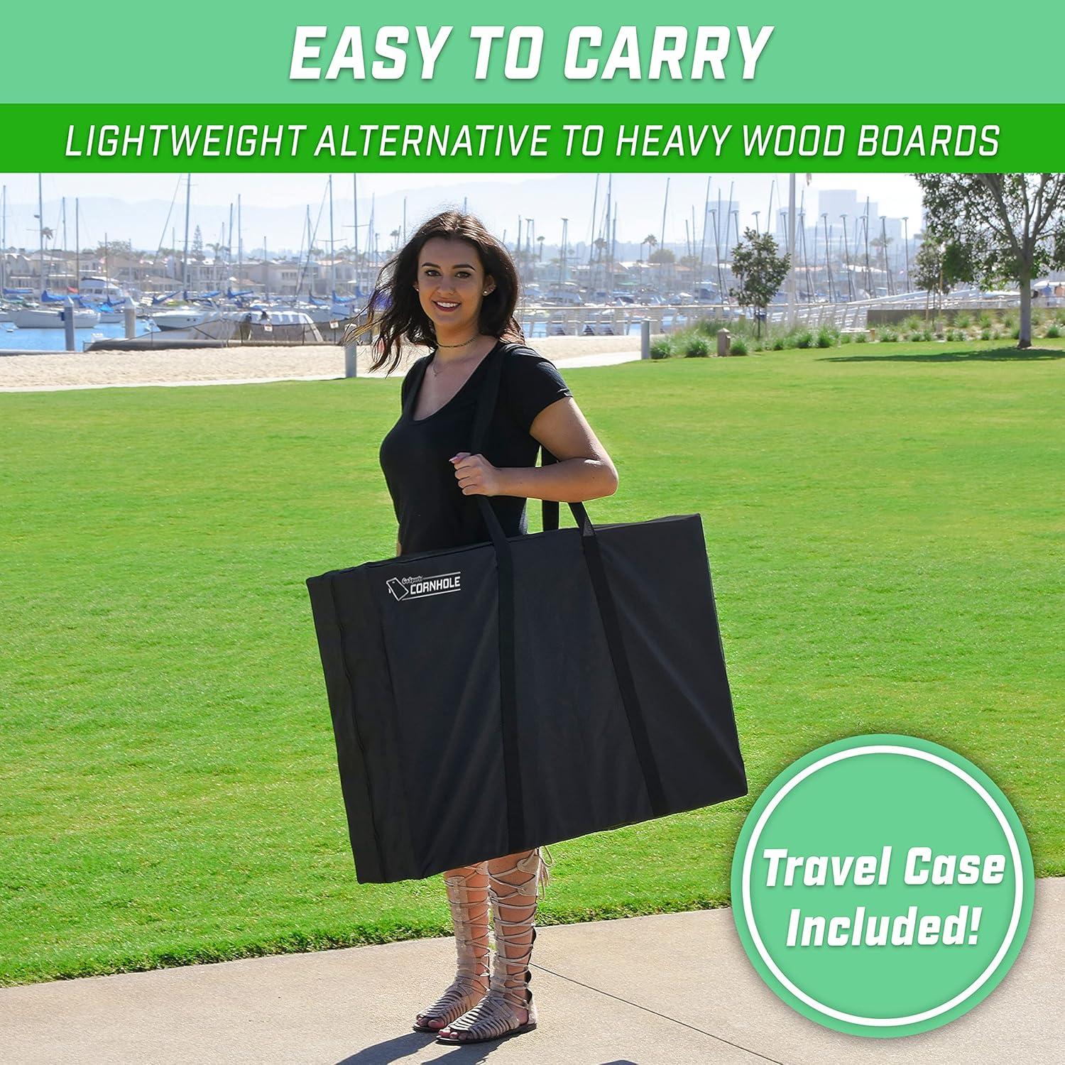COMPLETE GAME SET: Set includes two 3 ft x 2 ft collapsible bean bag toss targets, 8 regulation bean bags, carrying case, and game rules