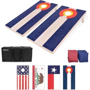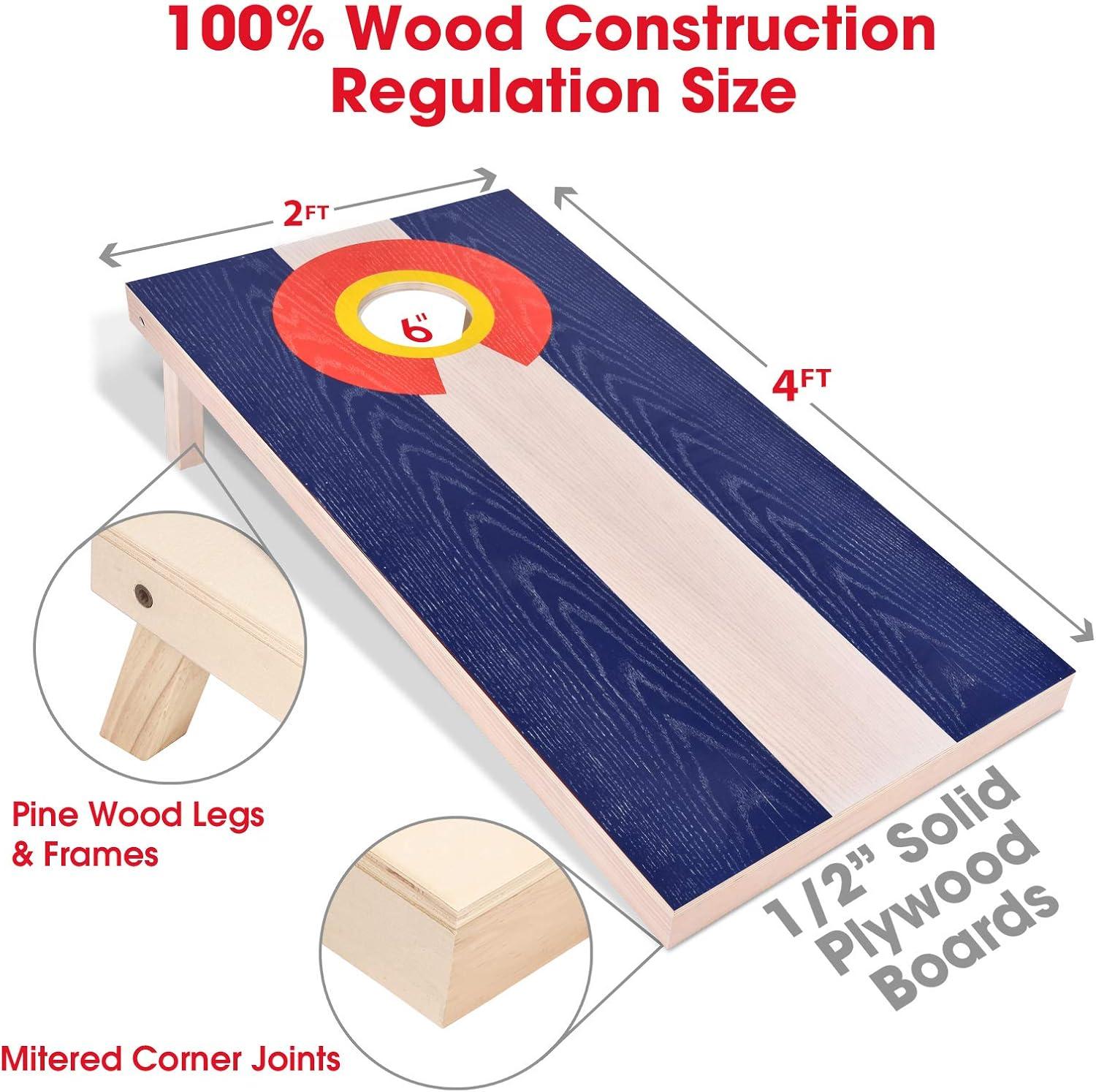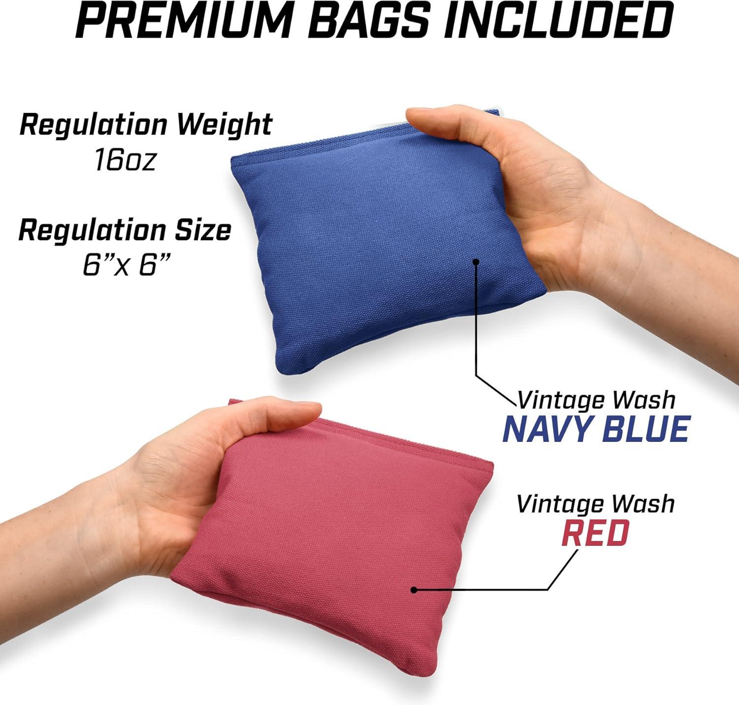 COMPLETE CORNHOLE SET: Includes 2 premium tailgate size 3 x 2 ft boards, 8 all-weather regulation size (6 x 6 inch) and weight (1 lb each) bean bags (4 red, 4 blue), & rules
