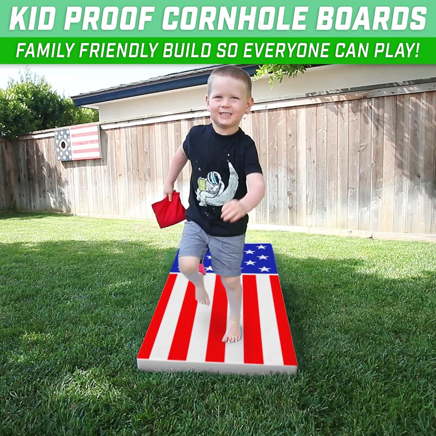 GoSports 4 x 2 ft All Weather Cornhole Boards – American Flag, Red, or Blue – Game Set Includes 8 Bean Bags & Rules(America)