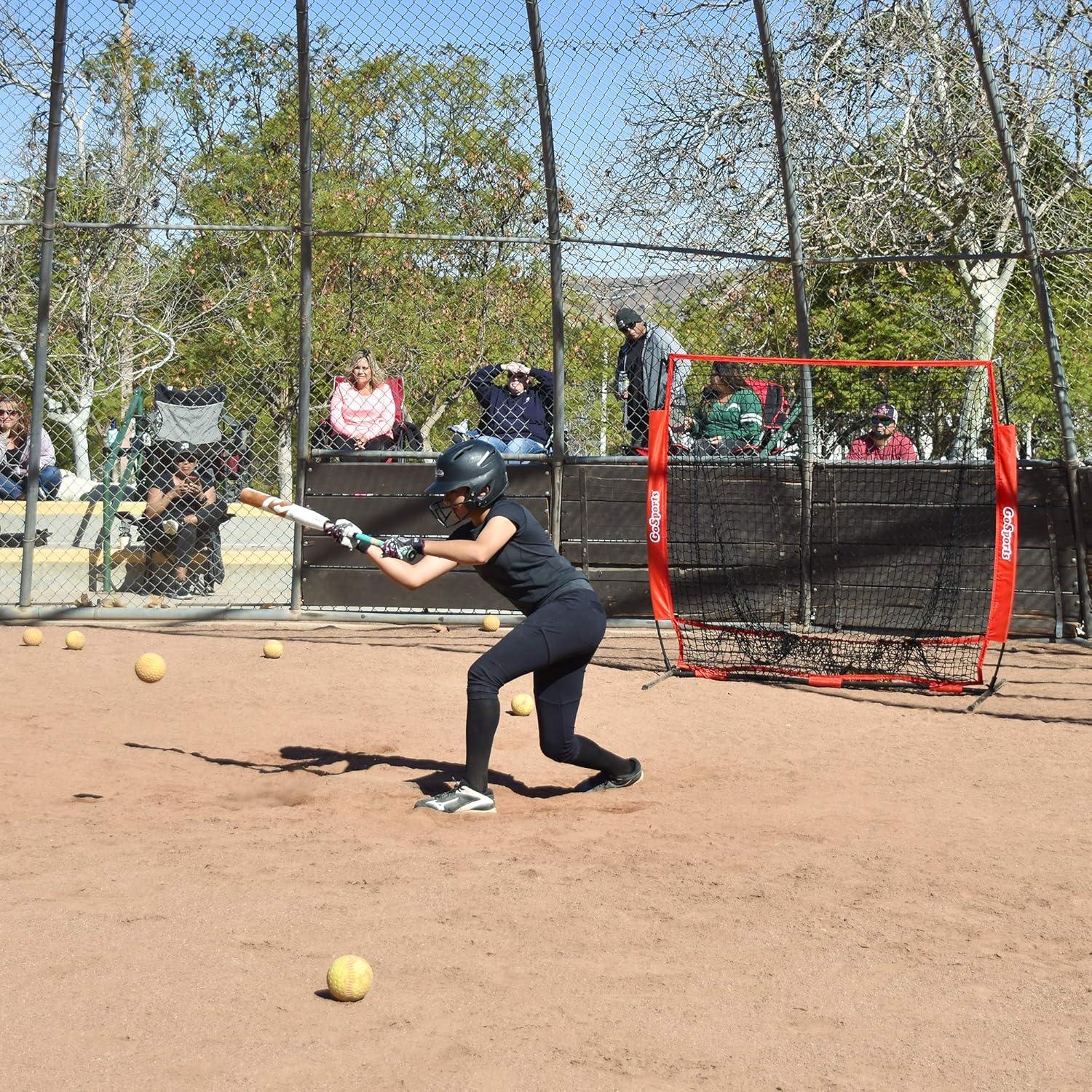 GoSports 5 ft x 5 ft Baseball & Softball Practice Hitting & Pitching Net with Bow Type Frame, Carry Bag and Strike Zone, Great for All Skill Levels(Red)
