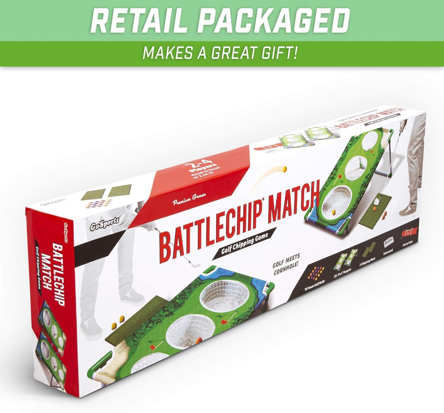 GoSports BattleChip is the ultimate outdoor game that combines the fun of golf with bean bag toss style games! Now you can host your own golf tournament in the backyard and compete over the course of 9 holes with 2-4 players of all skill levels for the title of BattleChip champ! The target is designed with a lightweight yet sturdy 3 ft x 2 ft PVC frame for easy portability and features our unique tear-proof fabric playing surface for durability. The game assembles in seconds so you're ready to start chipping in no time! Just remember to B.Y.O.C. – Bring Your Own Club! We wanted to make BattleChip affordable for everyone to enjoy so there is no club included. In case you don't have one, we recommend a Wedge, Sand Wedge, or Lob Wedge for maximum enjoyment. The game also quickly disassembles and stores neatly into the included carrying case (total weight under 10 lbs), so you can take it to any social gathering or event!.
