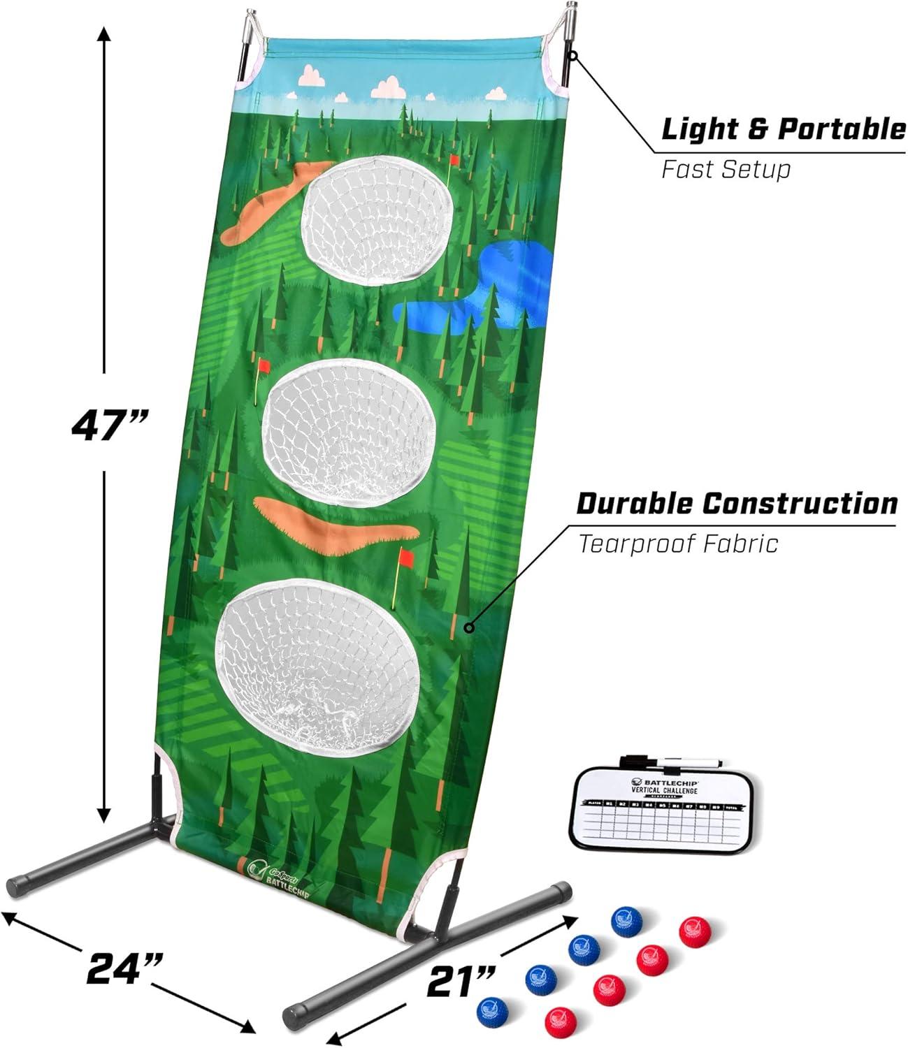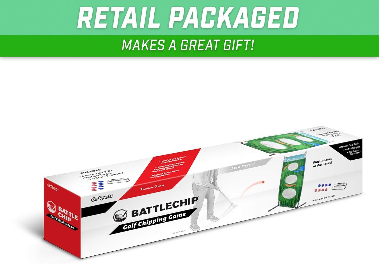 GoSports BattleChip Vertical Challenge combines the fun of golf with bean bag toss style games! Host your own golf tournament in the backyard and compete over the course of 9 holes with 2-4 players of all skill levels for the title of BattleChip champion! The GoSports BattleChip target is designed with a lightweight yet sturdy frame for easy portability and features our unique tear-proof fabric playing surface for durability. The game assembles in under 60 seconds so you're ready to start chipping in no time at your next family game day, cookout, camping trip, beach day and more! Just remember to B.Y.O.C. – Bring Your Own Club! We wanted to make BattleChip affordable for everyone to enjoy so there is no club included, but many golfers already have their own and in case you don't, we recommend a Wedge, Sand Wedge or Lob Wedge for maximum enjoyment. BattleChip is guaranteed to get everyone up and moving and enjoying yard games just like the good old days for real quality time!.