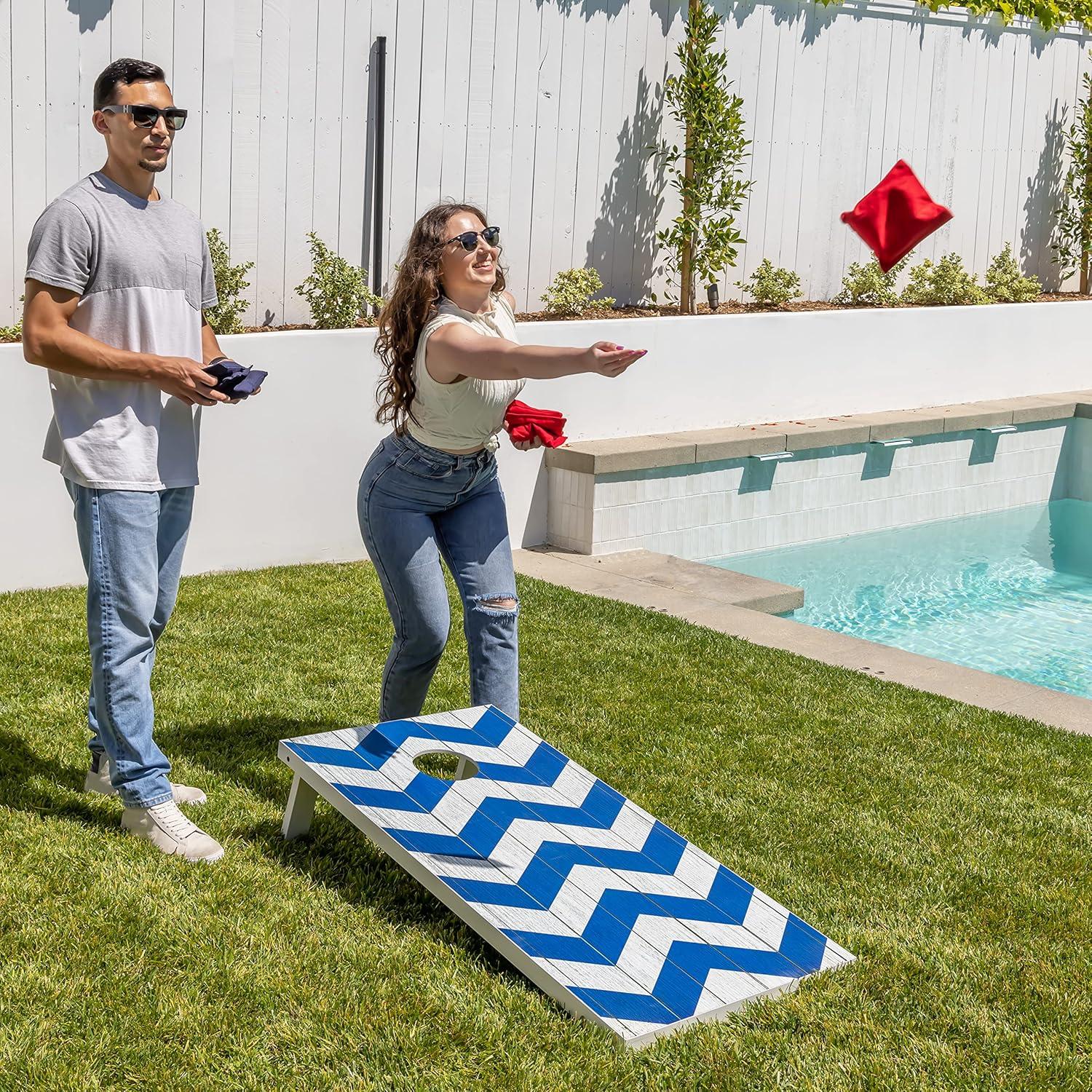 CHEVRON PATTERN: Modern inspired cornhole boards designed to look like painted red and blue chevron pattern wood planks