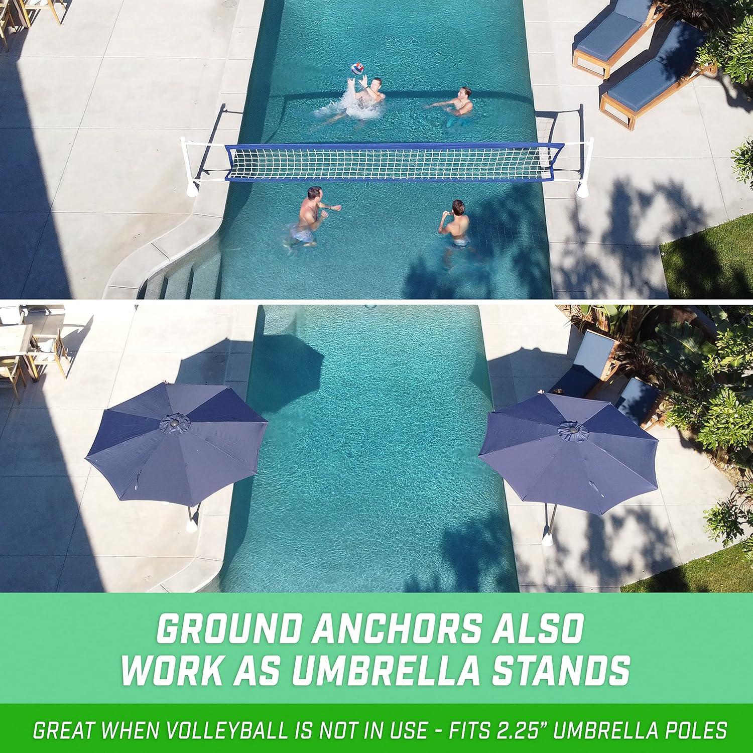 This ultimate pool volleyball experience is designed to be permanently anchored into your inground pool deck for endless summer fun. The full set includes all hardware required for concrete installation (professional installation required, instructions included). The Splash Net ELITE can also be anchored into wood, stone, brick, and tile (hardware not included – consult a contractor). The game includes a 15 ft net with adjustable straps that allow for a maximum width of 32 ft, 2 8 inch volleyballs, ball pump and storage bag. The ground anchors also double as weatherproof umbrella anchors. Simply take out the volleyball uprights and net and use the ground anchors to hold round pole market umbrellas and poles up to 2.25 in diameter (instructions included). The modern design is both fun and functional, featuring durable state of the art construction built to withstand years of competitive pool volleyball action!.