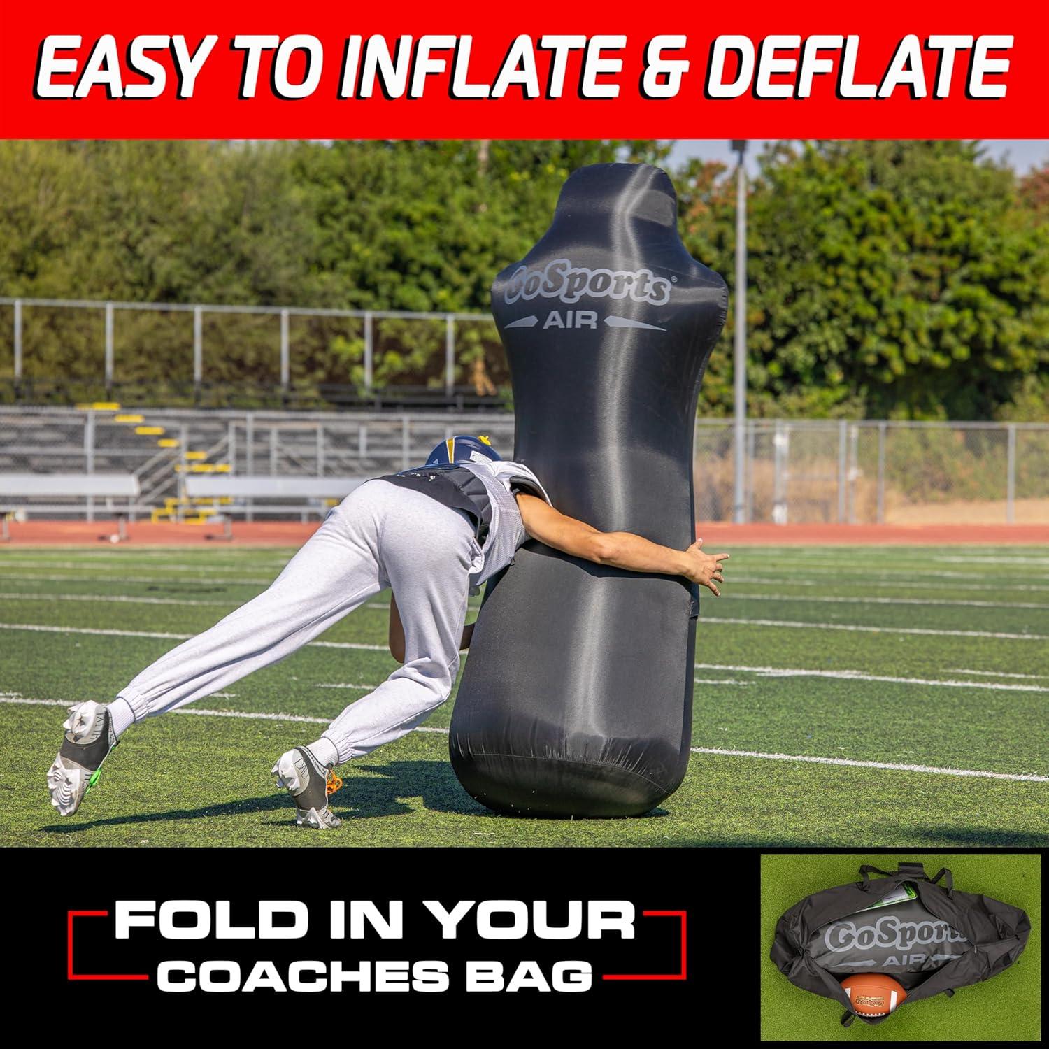 GoSports Inflatable Football Tackling Dummy is a versatile, life-sized blocking pad standing at 70 inches tall, designed for contact drills across various sports. Featuring three reinforced handles for versatile grip placement, the tackle dummy can be used for football, basketball, martial arts, & more. The inflatable, pop-up design allows for dynamic and realistic practice sessions. It features tear-resistant polyester to ensure durability and a robust inner bladder to absorb impact. Unlike traditional dummies, the water-weighted base design allows the dummy to stand on its own without a coach holding it up for versatile drills, and it stands back up after being knocked over. The dummy features a Rapid Valve for quick inflation and includes a pump, making it convenient to set up anywhere. Easy to inflate and deflate, it’s perfect for on-the-go training and can be effortlessly transported and stored, making it an essential addition to any sports training regimen.