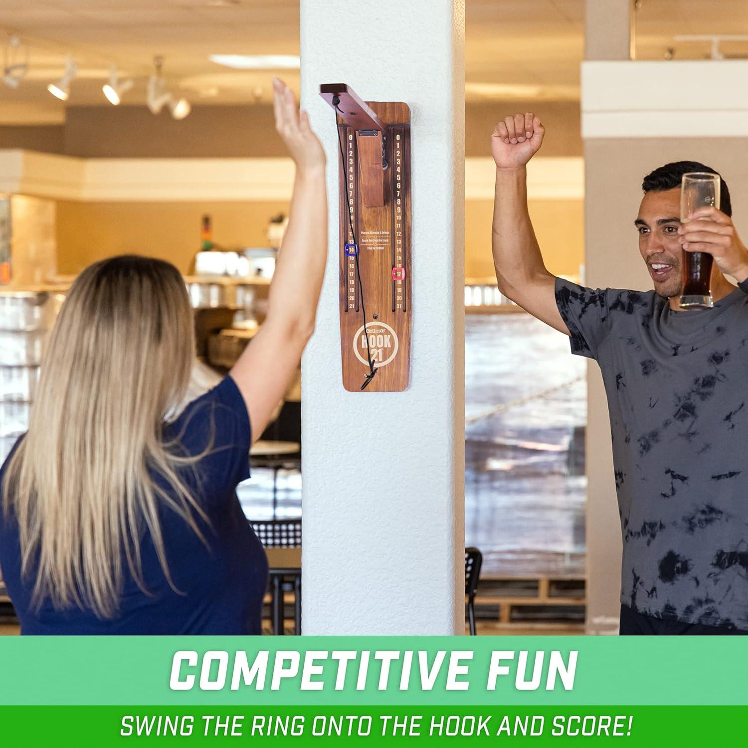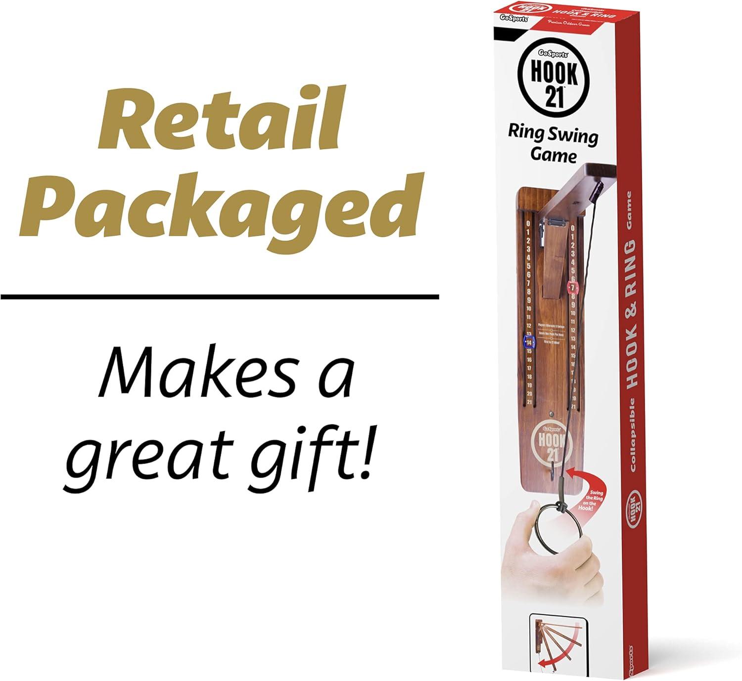 CLASSIC RING SWING GAME – GoSports Hook 21 is a modern take on the classic ring swing game. Players swing the ring on the hook to score, and the first player to 21 wins!