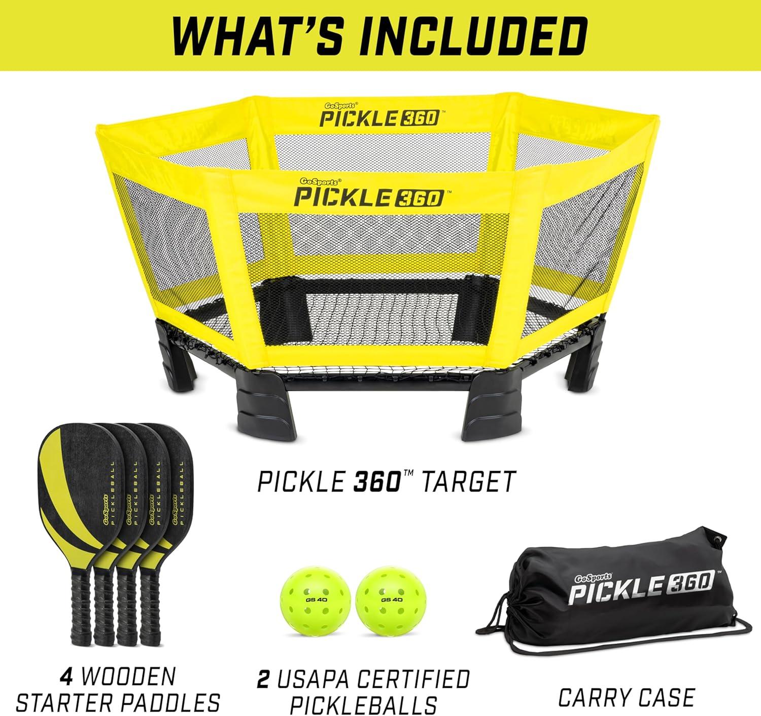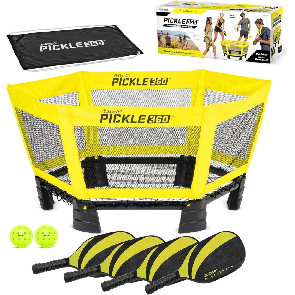 PICKLEBALL WITHOUT A COURT: Pickle 360 is a new action-packed 2-on-2 game inspired by pickleball that doesn't require a court; Using a paddle, players have 3 hits to spike or smash the ball into the net; Fun outdoor family game for ages 13+ and a huge hit with pickleball enthusiasts