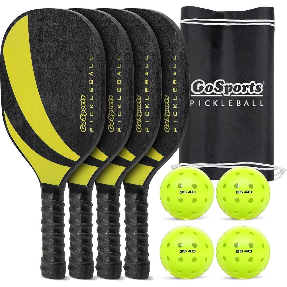 GoSports Pickleball Sets – Classic, Retro, Steel Blue, or Yellow – Includes 4 Paddles, 4 Regulation Pickleballs and Carry Case(Yellow)