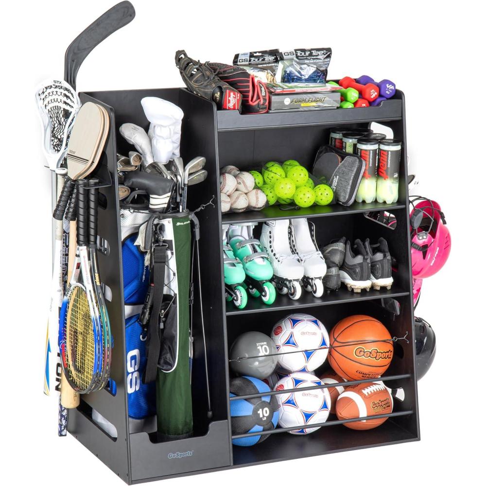 Declutter the garage and keep sports equipment and accessories looking neat! The GoSports Wooden Sports Equipment Organizer is a modern space-saving solution for neatly storing all the equipment that comes from having a sports family. The storage rack is great for golf, baseball, soccer, basketball, tennis, kids sports & toys and more! The premium build features a sturdy wood construction and is painted black for a clean look that complements your home. Don't settle for flimsy metal wire storage racks! Upgrade with multiple heavy-duty storage compartments: 1 main bin for large items, 3 shelves, ball bin, bat rack, and 8 hooks. The organizer includes illustrated step-by-step instructions for easy assembly; assembled size measures 44 L x 20 W x 47 H inches. The main bin measures 12 L x 20 W x 47 H inches. Reclaim your garage space with the GoSports Wooden Sports Equipment Organizer!