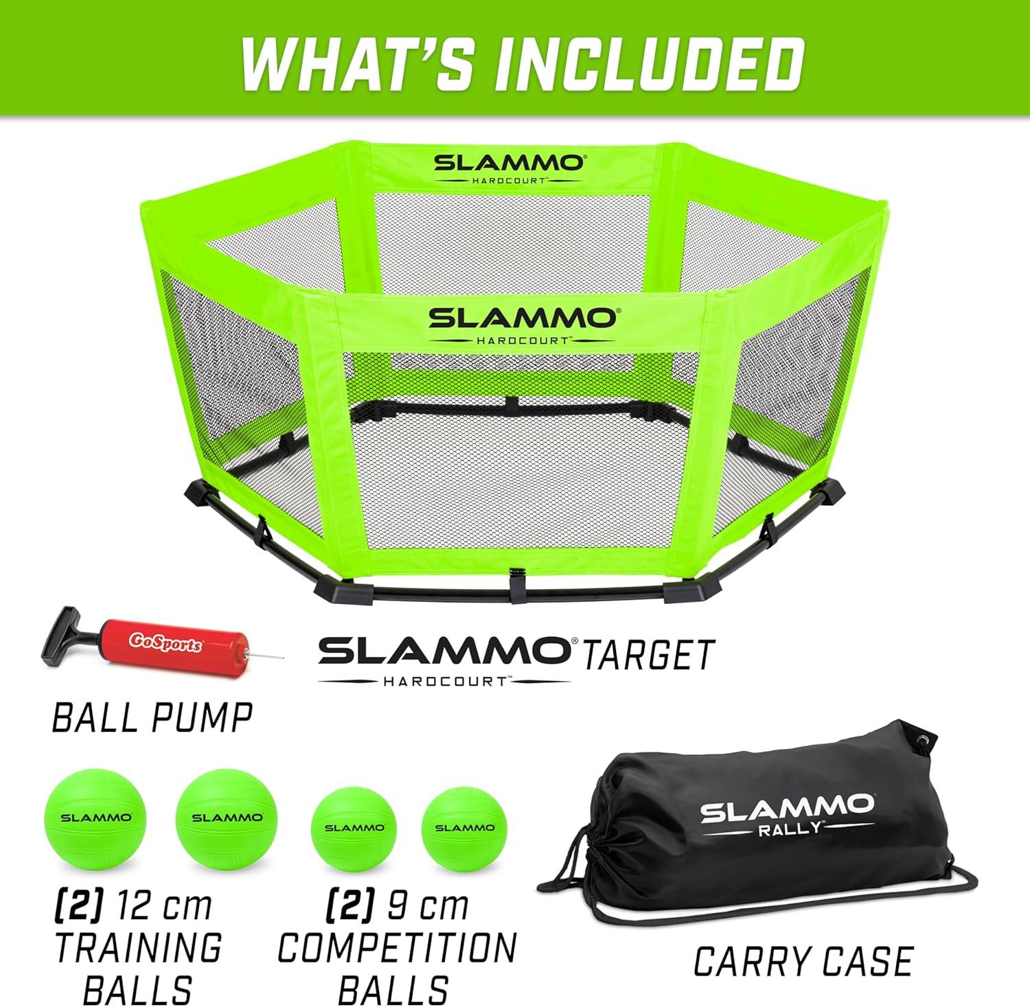 COMPLETE SET: Includes 1 Slammo Rally Hardcourt target, 2 large 12 cm training balls to learn the game, 2 smaller 9 cm competition balls, ball pump, carrying case, and rules