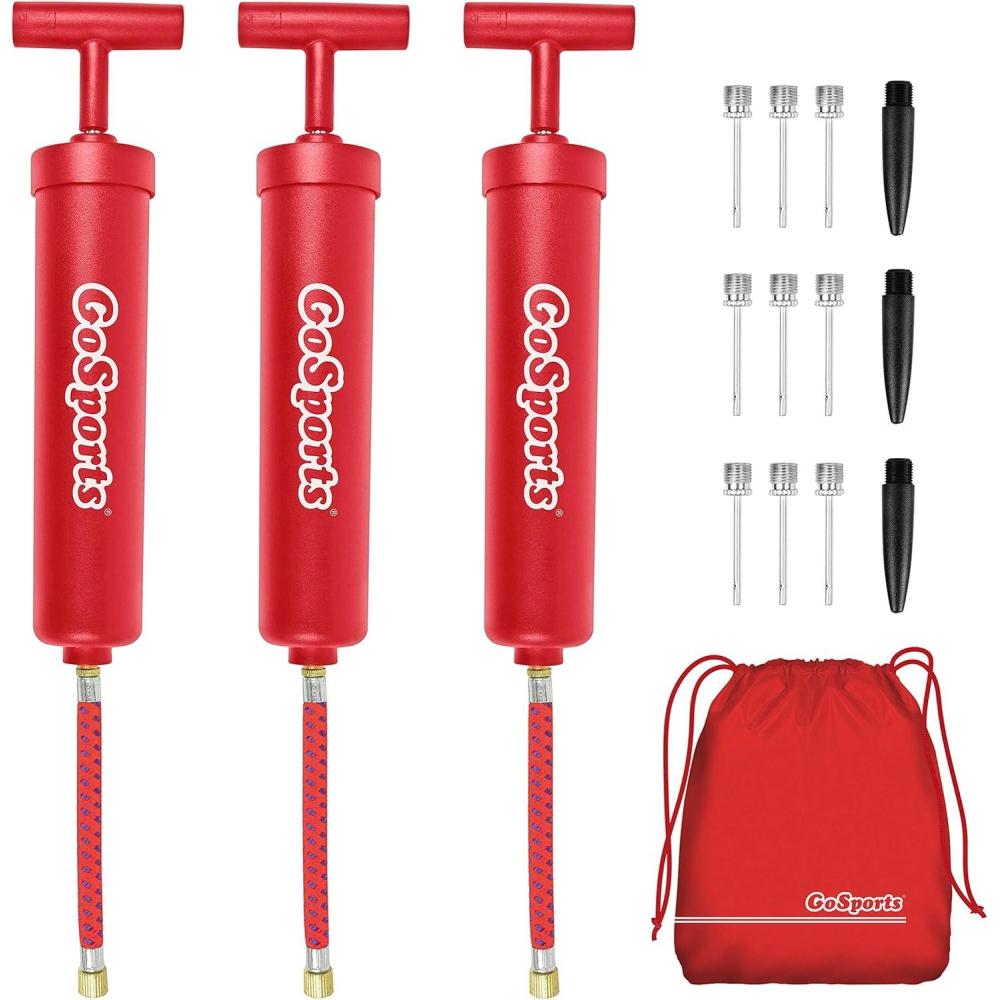Never worry about your sports balls going flat again with the GoSports ball pump 3 pack. Our pumps are 25% larger than the leading competition so they are comfortable in your hands and take less pumps to fill up your balls. We include 9 metal needs for sports balls and 3 plastic Needles for inflatable toys. The pumps also feature a flexible Hose to ensue the Needles never break off in the ball. The set also includes a tote bag so you never lose any of the parts. The pumps are backed with a full 1 year replacement warranty so you can buy with confidence.