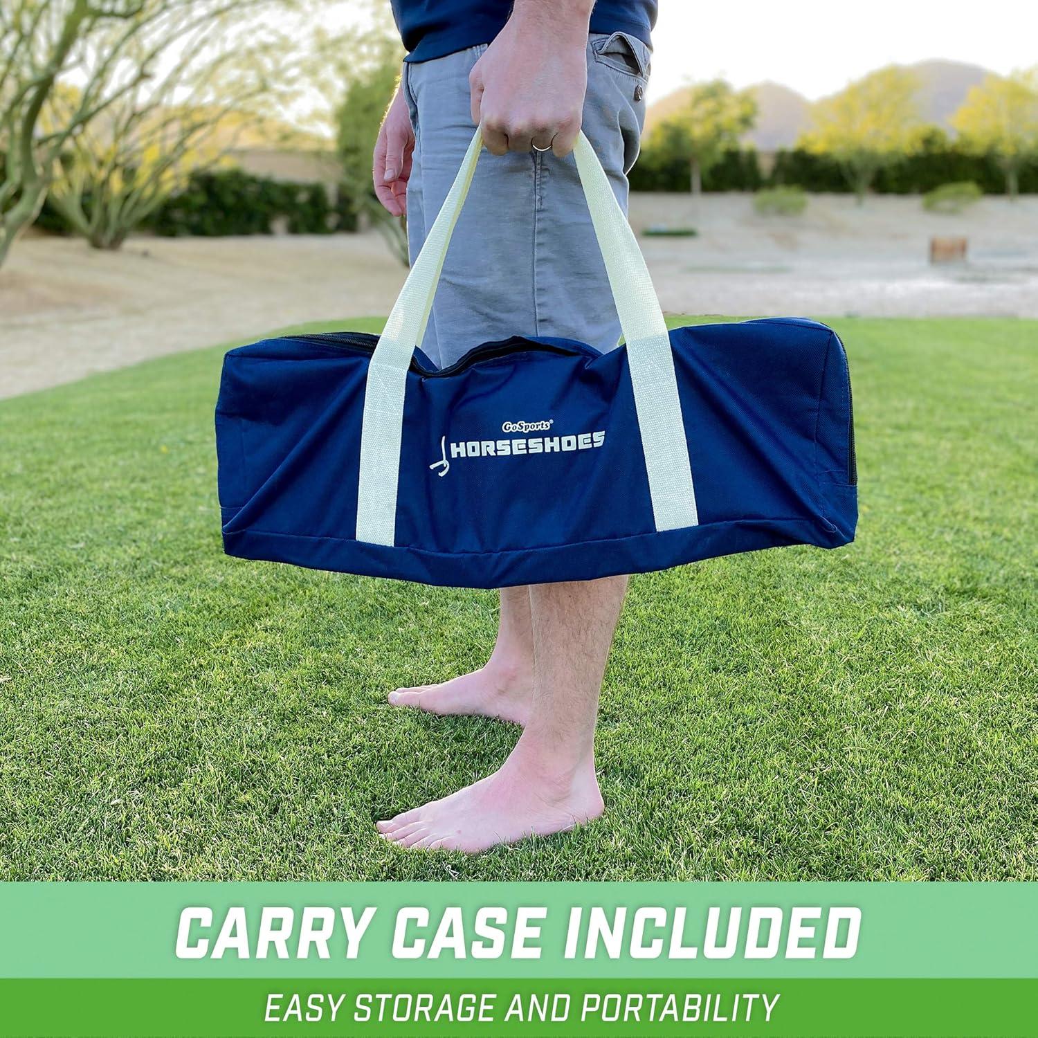 INSTANT SETUP: Securely stakes into grass, sand, and dirt, or set up in an official horseshoe pit; Easily carry the full set to your next game, no carrying case needed