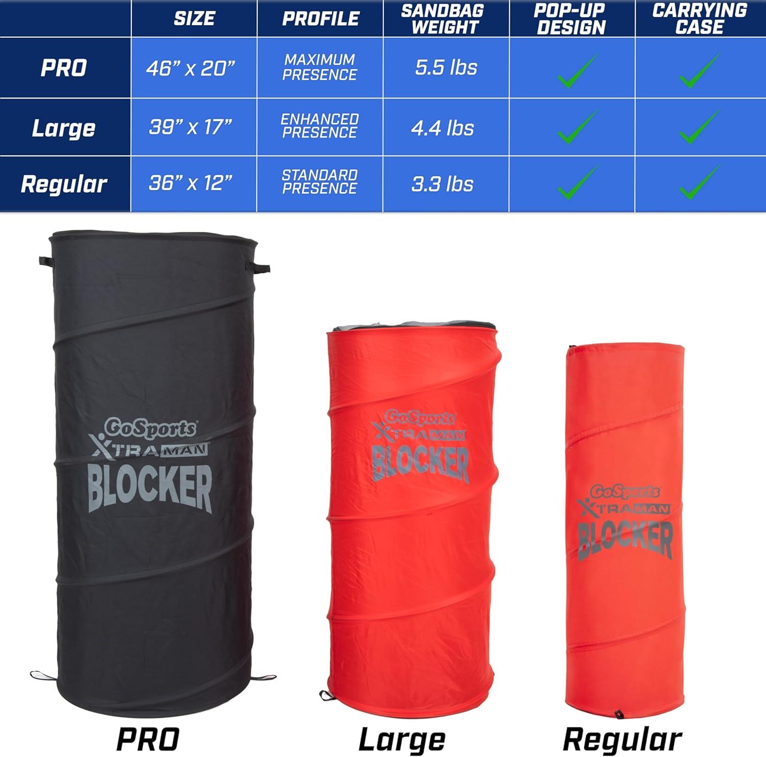 The Xtraman Blocker Pop-Up Defenders are game changing multi-sport training aids for safely simulating opposing defenders and obstacles. Complete set includes 3 pre-weighted collapsible blockers, carry case and instructions with example drills. Professional coaches can now upgrade practice sessions with more dynamic training! The defenders instantly pop-up so coaches can set up athletes for game day success by encouraging proper footwork and agility on any court or field. The blockers are each pre-weighted with 4lb sandbags for stability to resist tipping in indoor and outdoor training conditions for all major sports: basketball, soccer, football, lacrosse, baseball and more! The collapsible design makes the blockers compact and easy to store in the included carry case for convenient portability. Now coach and train like the pros with GoSports Xtraman Blockers!.