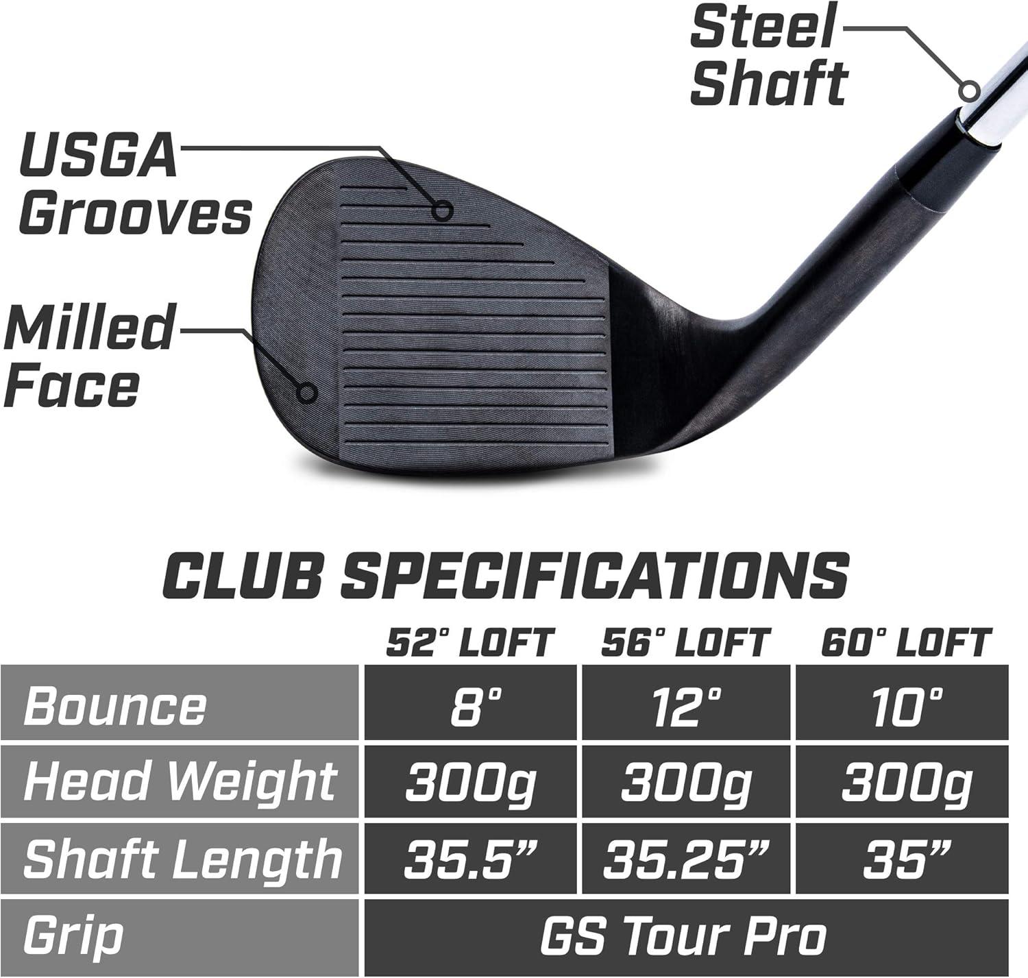 GoSports Tour Pro Golf Wedge Set – Mens Right Handed 52 Gap Wedge, 56 Sand Wedge and 60 Lob Wedge in Satin or Black Finish(Black Set (52 56 60))